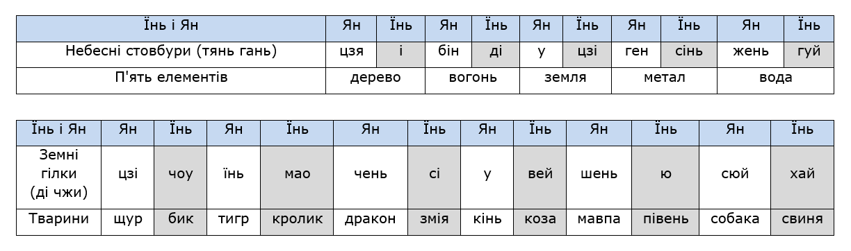 Таблиця 1. Небесні стовбури (тянь гань) та Земні гілки (ді чжи)
