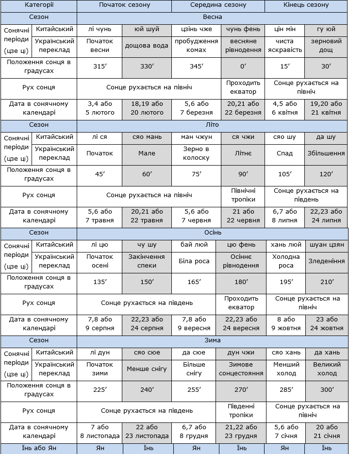 Таблиця 2. Сонячні періоди (цзе ці) у китайському календарі